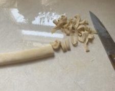 Nach dem Rasten den Teig leicht bemehlen, locker aufrollen und in 5 bis 8 mm breite Streifen schneiden , sofort einzelne Nudeln ausrollen – locker auflegen.