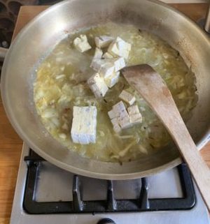 Schimmelkäse in Würfel schneiden und zugeben – sofort mit der Kokosmilch aufgießen und unter gelegentlichem Umrühren aufkochen lassen – getrockneten Basilikum jetzt zugeben – wenn du frischen verwendest – erst zum Schluß