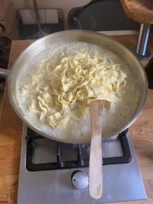 Sauce kurz aufkochen, die Nudeln direkt nach dem Abgießen in die Sauce geben – kleben sonst zusammen – und in Sauce einrühren – kurz simmern lassen – sollte die Sauce zu dick werden – etwas Nudelwasser einrühren