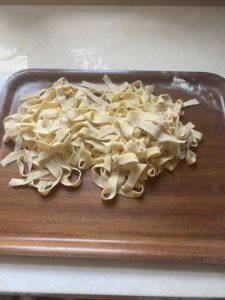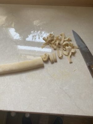 Nudelteig nach dem Ausrollen 10 Min. rasten lassen, aufrollen und 5 bis 8 mm breite Streifen schneiden