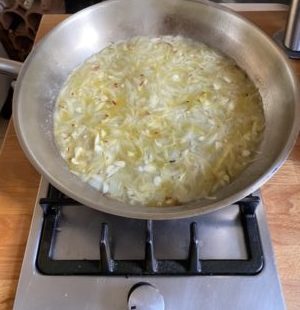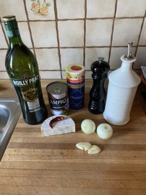 Zwiebel, Knoblauch und Chili in Olivenöl anbraten, mit heißem Wasser aufgießen, einreduzieren – 2 x wiederholen – so wird der Zwiebel cremiger und caramelisiert leicht – nach dem 3. mal einreduzieren mit einem guten Schuß Wermuth ablöschen